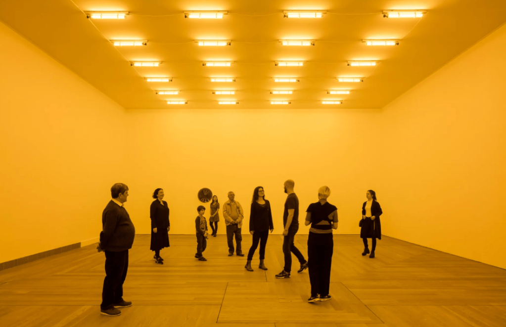 Photo: Anders Sune BergMonofrequency lights mounted to the ceiling of a white room emit a narrow range of yellow light, reducing visitors’ color perception to shades of yellow and black. The longer the visitors stay in the space, the more they begin to perceive subtle color distinctions and to correct for the yellowish lighting. Upon leaving,they momentarily perceive a bluish afterimage. (Eliasson et al., 2006)