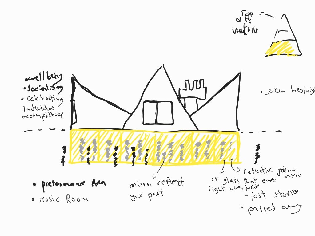 Moreover, the large one-way mirror will offer space for people to express emotions or write names of loved ones. Sunlight will project these emotions onto the interiors.
